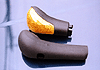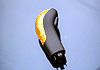 そして次の問題はシフトノブ下半分の何も無い部分をどうするかです。 シフトブーツをぶら下げるとか、軸を黒く塗って目立たなくするとか、いろいろ考えているうちに、旧シフトノブから下半分を切断して持ってくるアイディアを思いつきました(写真左)。 結果的にはこれが一番よい解決方法ではなかったかと思っています。 旧シフトノブは外側が硬質ゴムで内部は硬質プラスチックなので切断には結構苦労しました。 私は何と木工用ののこぎりで切ってしまいましたが、金属加工用の金ノコがあればそちらがお勧めです。 移植する旧シフトノブの下半分(私の940の場合では51mm)を2〜3mm長めに切っておいて、ドリルの先端に付けた円盤やすりで削りながらちょうど良い長さにしました。