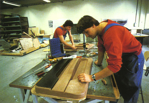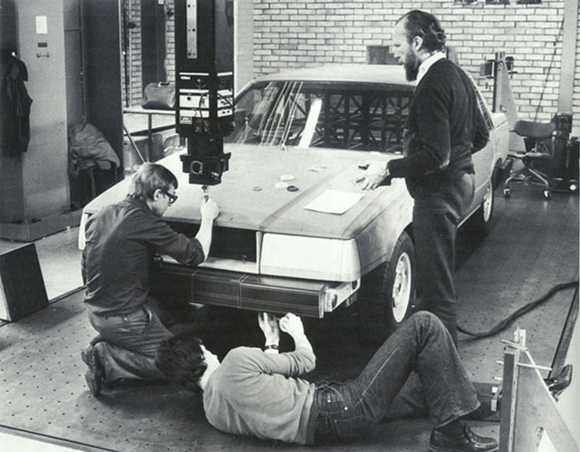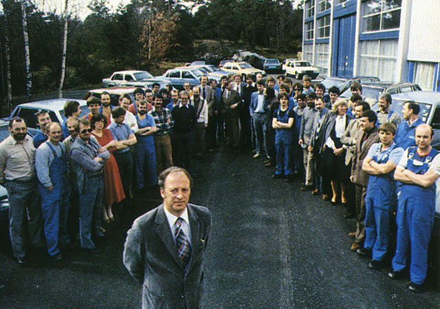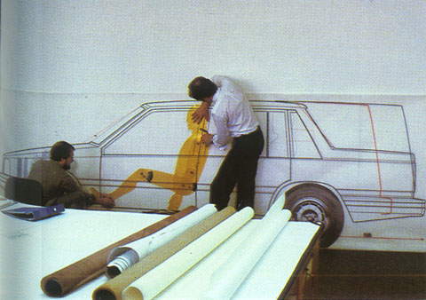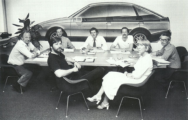 左の写真はデザイン・センターの幹部たち。左から、ヤン・ウイルズガード部長、ラッセ・ペッテルソン(インテリア・デザイン・マネジャー)、マッツ・ブロベック(管理およびワークショップ・マネジャー)、ヤン・レイク(チーフ・プロジェクト・エンジニア)、ロルフ・マルムグレン(エクステリア・デザインU・マネジャー)、ベリス・ラーソン(秘書)、スティグ・フォーク(エクステリア・デザインT・マネジャー)。